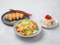 Рис с сушизой, водоросли нори, курица филе запеченное, лист салата, сухари панко, икра тобико красная, сыр творожный