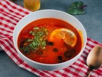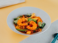 Креветки тигровые, кальмар, грибы шиитаке, томаты черри, рис, бульон том ям, лемонграсс, лист каффир-лайм, перец чили, лайм, кинза, кунжут.