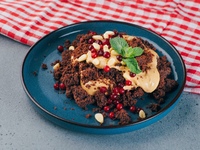 Шоколадный бисквит, сметанный крем, брусника, кедровый орех