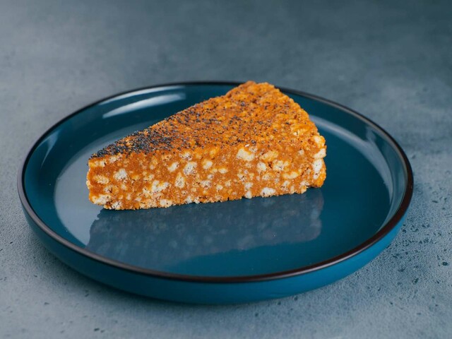 Рулет белковый, сыр творожный, сливки, сахар, пюре маракуйя, манго, лепестки миндаля, ягода сублимированная.
