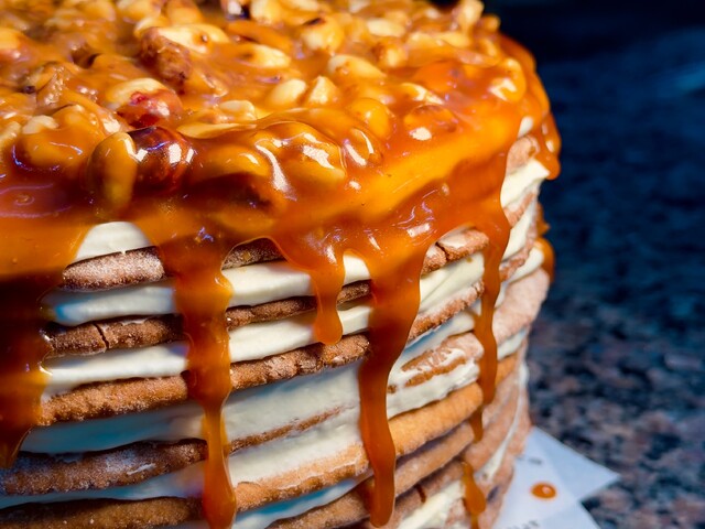 Коржи медовые, сметана, сливки, соус карамельный.