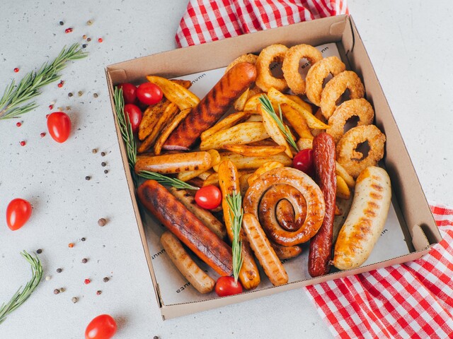 Ассорти гриль (колбаски), стрипсы картофельные с луком, луковые кольца, соус барбекю, кетчуп, помидоры черри