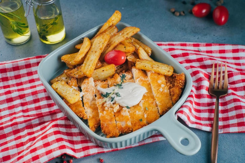 Хрустящая курочка с фри и соусом пармезан черный перец