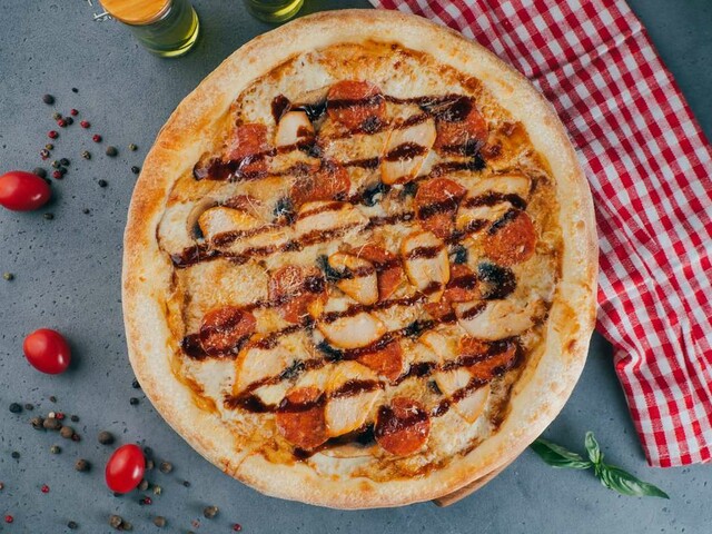 сыр моцарелла, соус терияки, шампиньоны, курица филе запеченное, колбаса пепперони