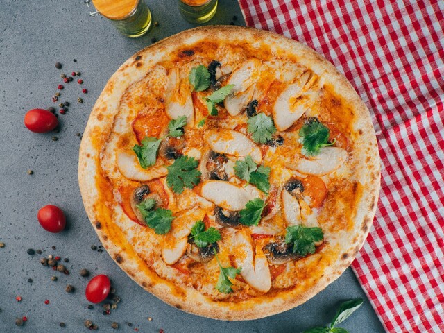 Шампиньоны, индейка, моцарелла, лук, трюфельное масло, пармезан, соус перечный.