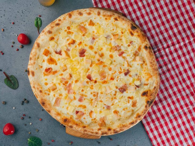 сыр пармезан, сыр моцарелла, курица филе запеченное, бекон, ананас